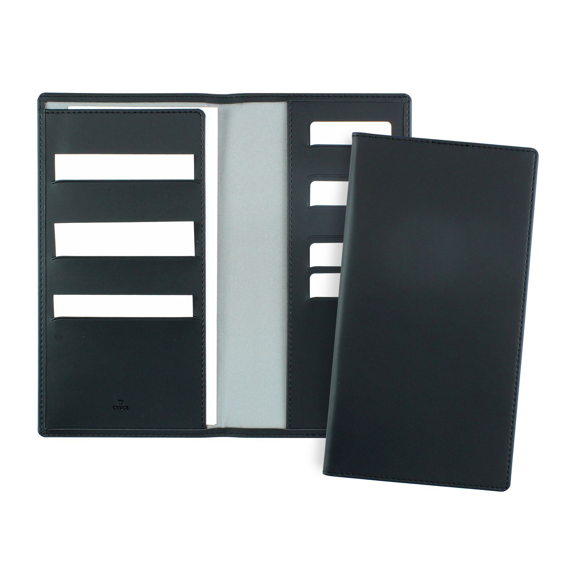 Black Travel Wallet in recycled Como, a quality material made from waste plastic bottles that would normally go to landfill. This high-quality vegan material has a subtle grain, Ideal for debossed, or digitally printed branding. Product features include - One pocket with slots to hold passports, Pocket behind to hold boarding cards, tickets and currency, One matching PU pocket with slots for credit cards, Folded and stitched edges for a quality finish, Soft recycled material that is REACH compliant.
